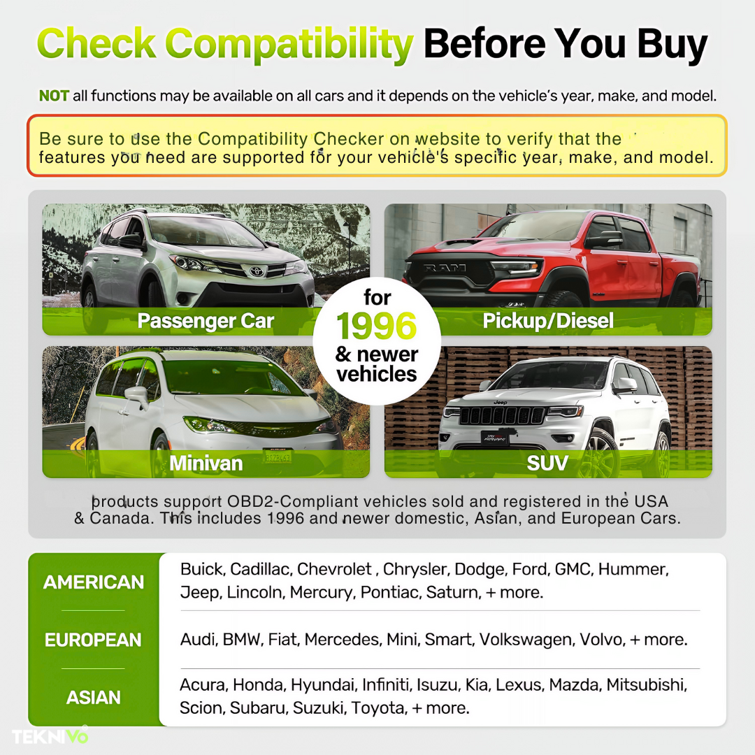 From sedans and SUVs to light trucks, the Teknivo AutoScan™ supports most 1996–2023 vehicles in the USA & Canada. Whether you’re a DIY car owner or a family with multiple cars, it’s built to work across your garage.
