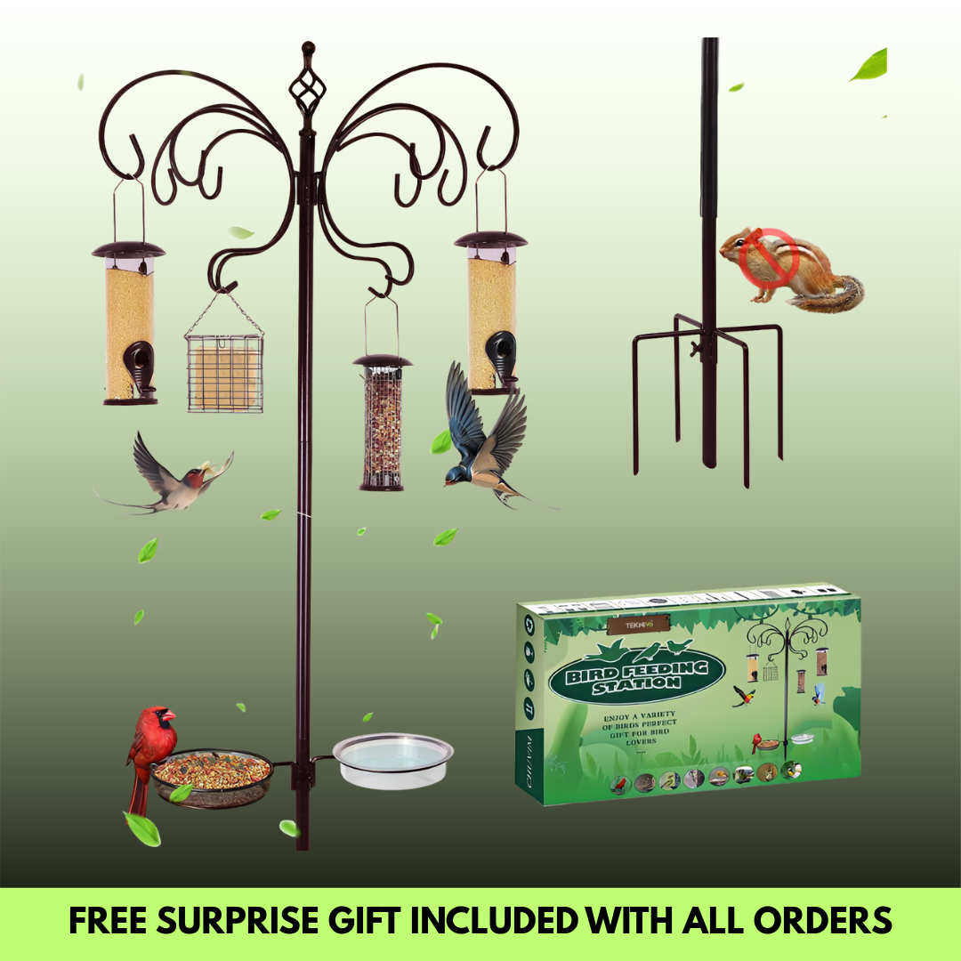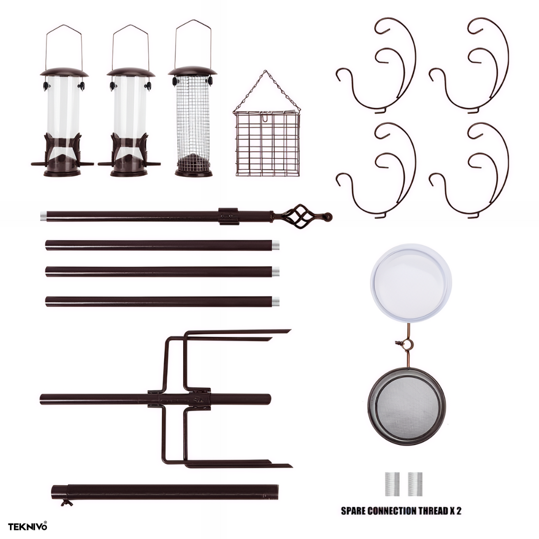 Just minutes. The Teknivo FeatherGuard™ is designed for quick assembly — simply place the pole in the ground, attach the feeders and trays, and enjoy a complete bird feeding station. No special tools required.
