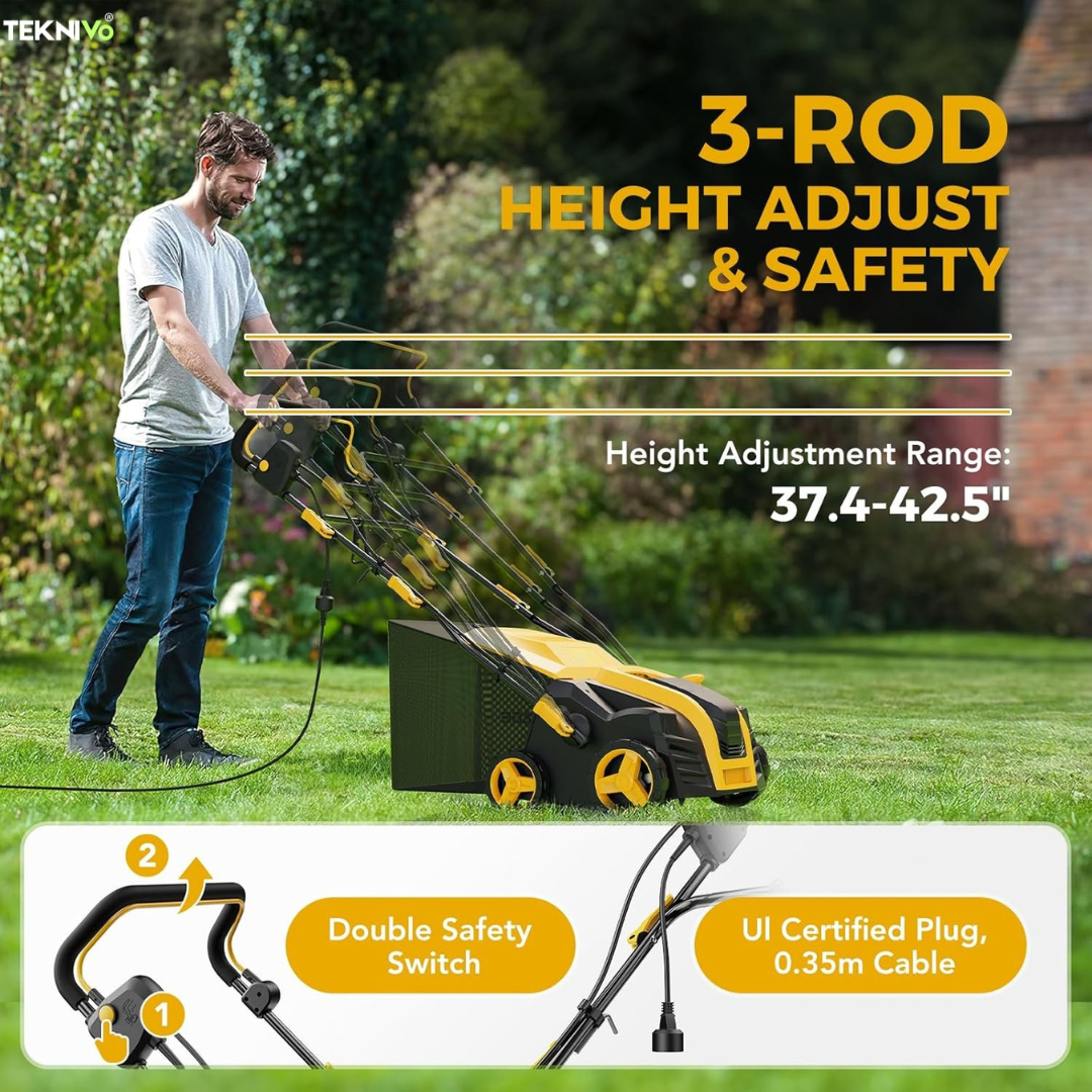 Yes. The Teknivo LawnPro™ combines a powerful 15 Amp motor, integrated safety features, and a convenient 14.5-gallon collection bag. Maintenance is simple—just empty the bag and clean the blades occasionally for long-lasting performance.