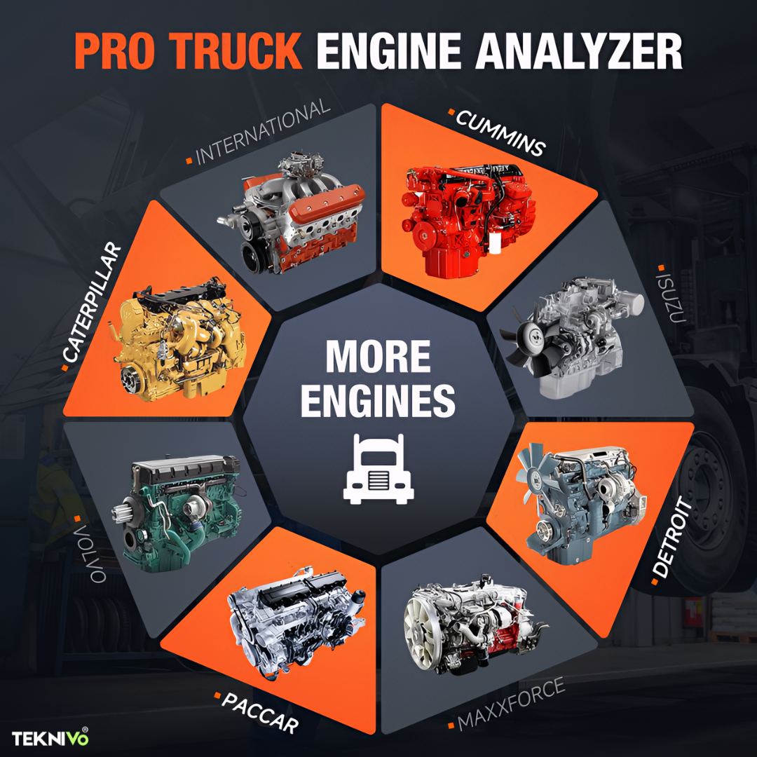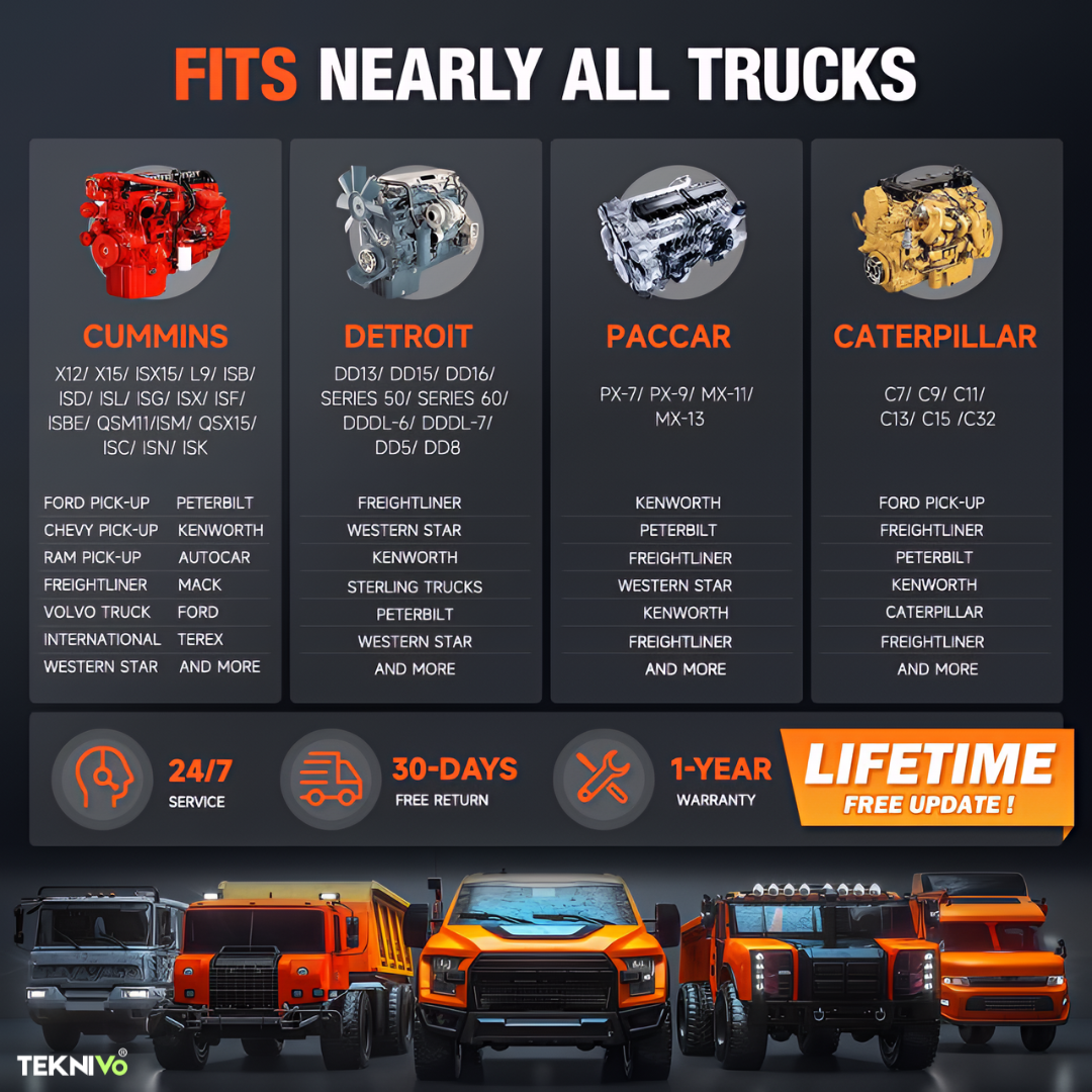 Fully supports Cummins, CAT, Paccar, Detroit, and other heavy-duty diesel engines, making it the perfect tool for mechanics, fleets, and independent operators.