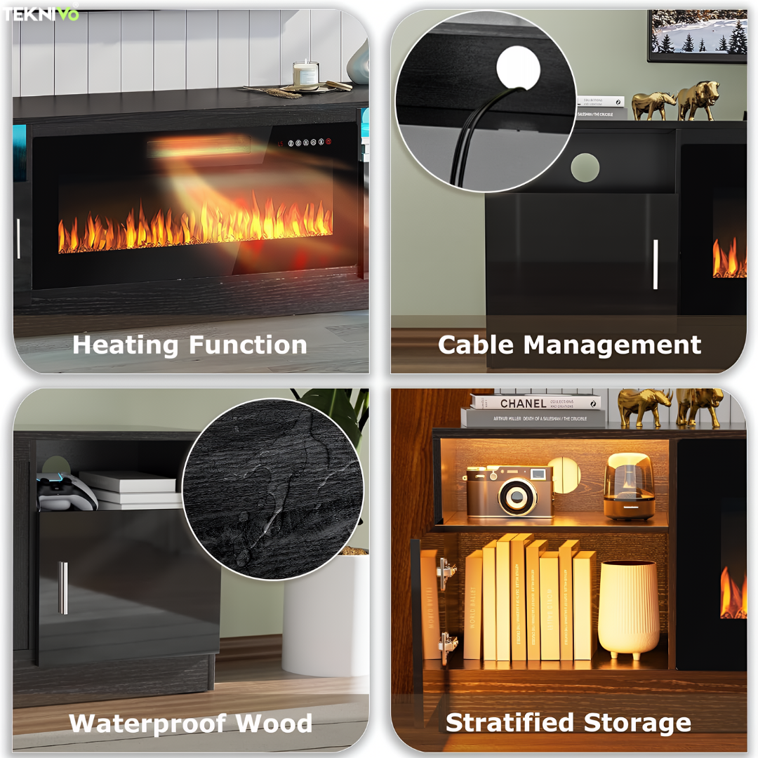 From small apartments to large homes, the Teknivo Spark™ adapts beautifully. Its spacious surface holds TVs up to 80", while the built-in 36" electric fireplace and LED lighting create a cozy, modern atmosphere in any room.