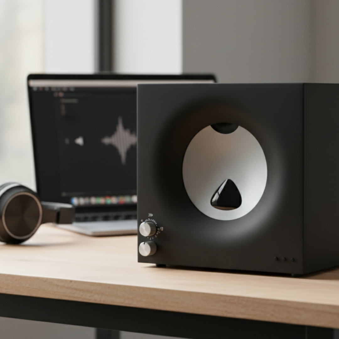The Teknivo ToneView is designed with a modern, space-friendly form factor that fits easily into your setup. Its cubic, minimalist design ensures a striking look while staying practical for most rooms.